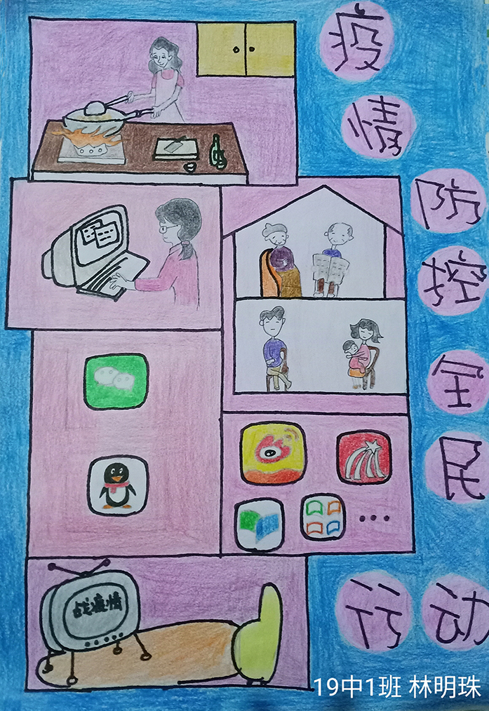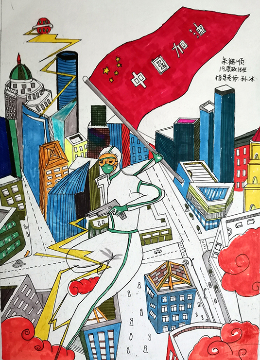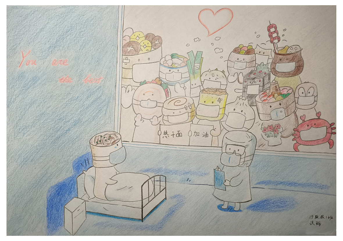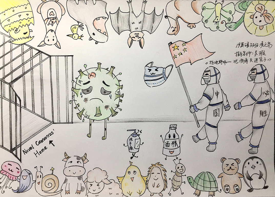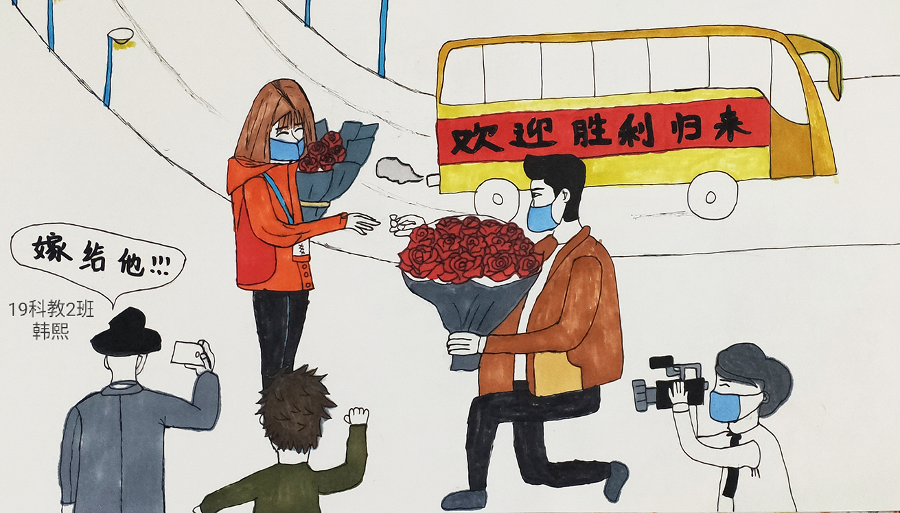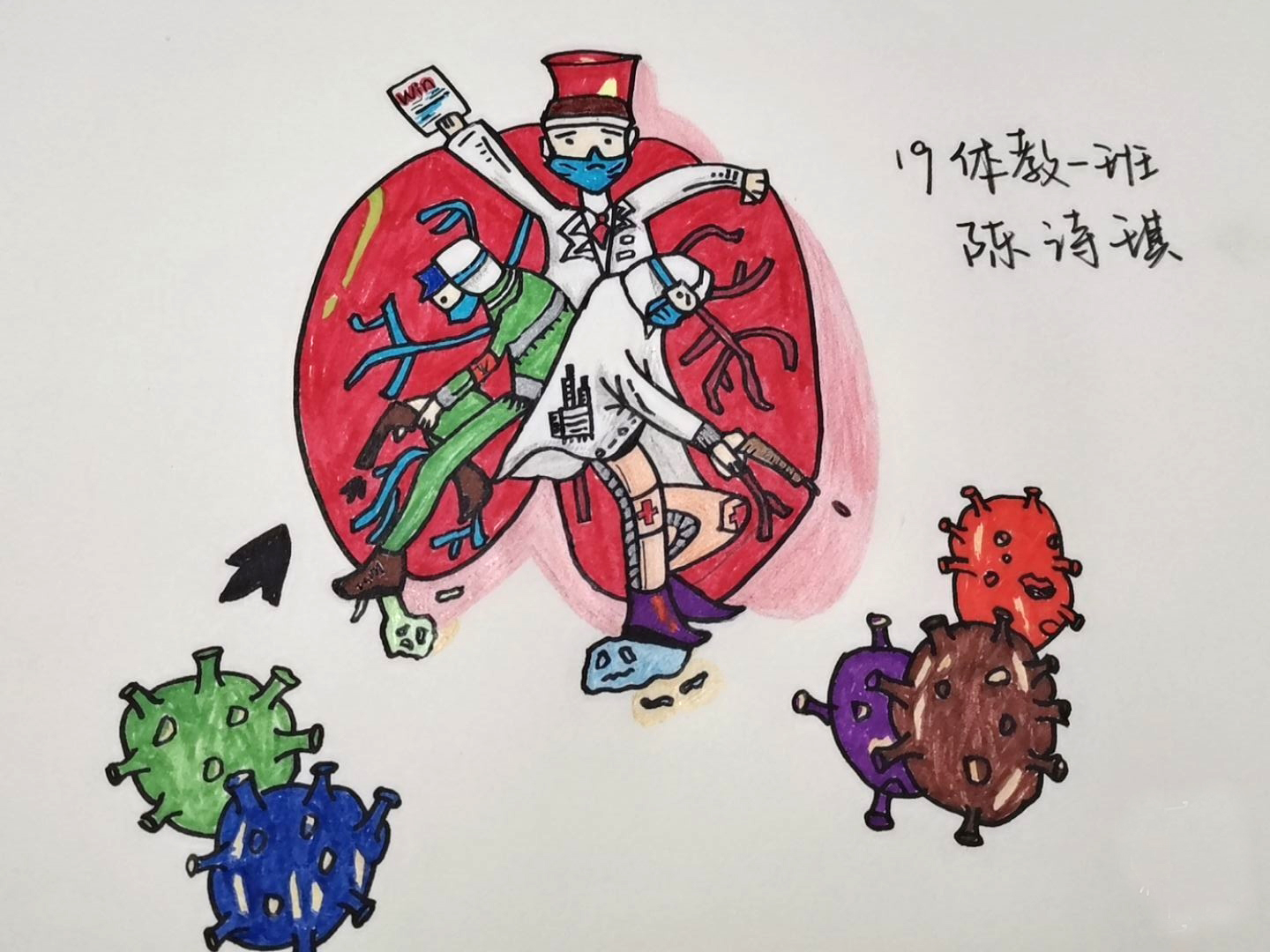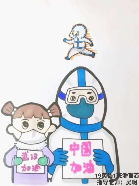 简笔画教学是《美术基础》课程内容中的重要组成部分,教学重点在于加强师范生的简笔画绘画技能,提高美术素养与多元化教学能力,为今后的教学实践打下基础。这次主题创作活动是课程组孙冰、曾素艳、谭媛元、吴瑕、易琼娟五位教师共同探究新时代课堂教学中“课程思政”的一次教学实践。针对抗击疫情期间师生们对抗疫进展与社会现象的关注,结合美术创作“以人民为中心”的指导思想,课程组五位教师通过多次研讨课程内容与授课方式,决定结合慕课平台线上教学进度与课程内容,组织所授班级包括科教、体育、音乐、应数等十个专业926名学生(师范类非美术学专业)共同参与“战疫情·爱不隔离”简笔画主题创作。同学们在掌握简笔画学习与表现规律的同时,将抗疫期间的英雄事迹、感人镜头用画笔展现,将感动之情运用隐喻、借喻、拟人或直抒胸臆等多种手法表现,表达青年的爱国情怀与内心感悟。课程组五位教师在十个班级中选出了75幅优秀作品进行线上展览,呈现出不同学科专业学生们凭借艺术的力量以“艺”抗“疫”。