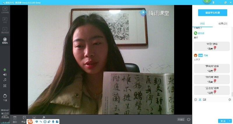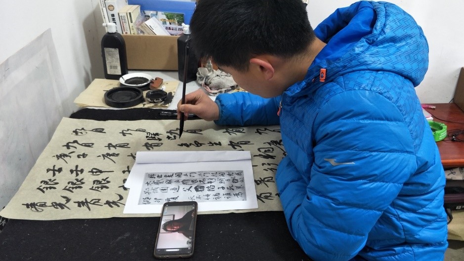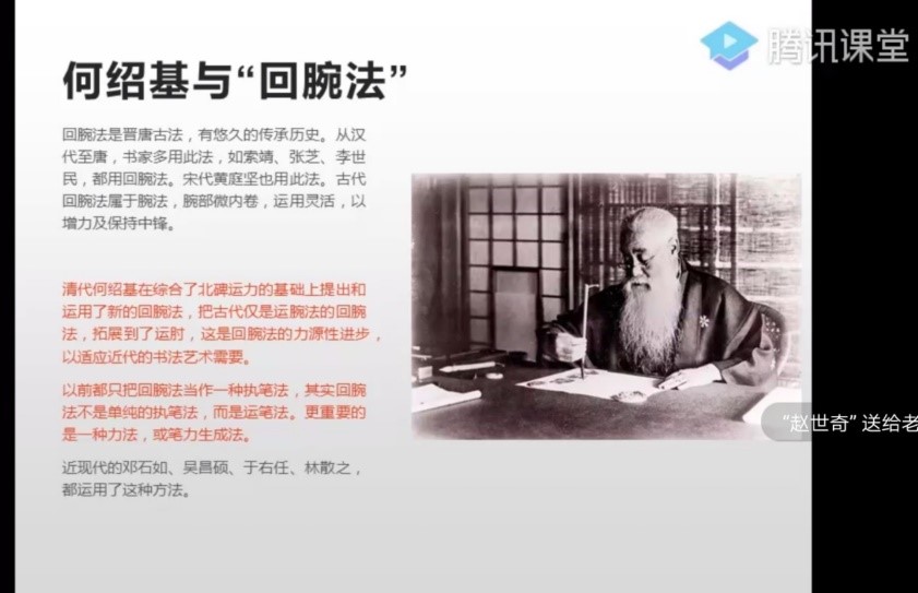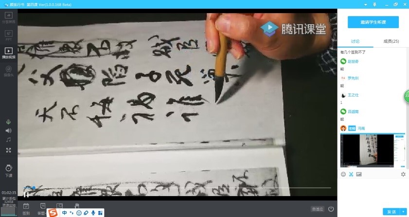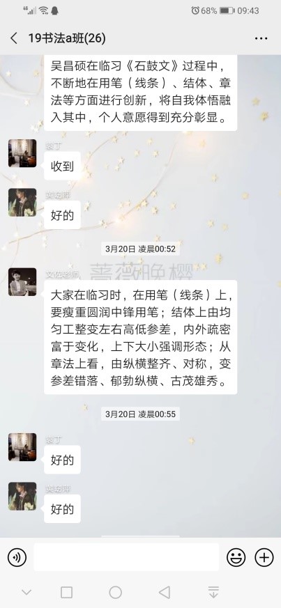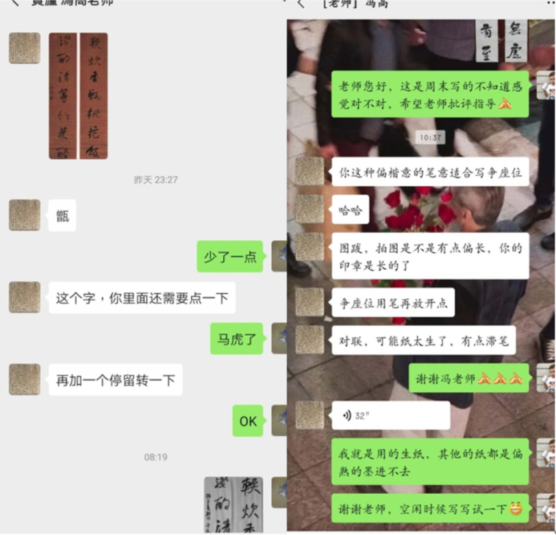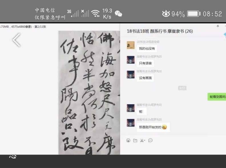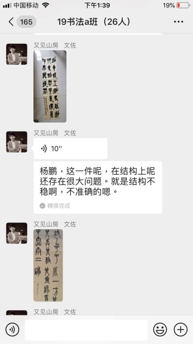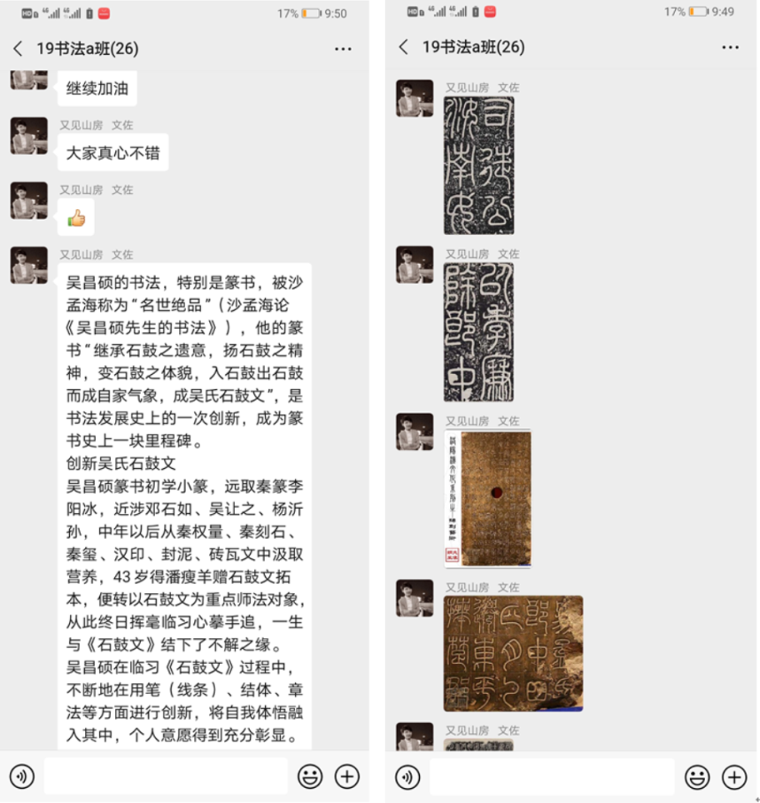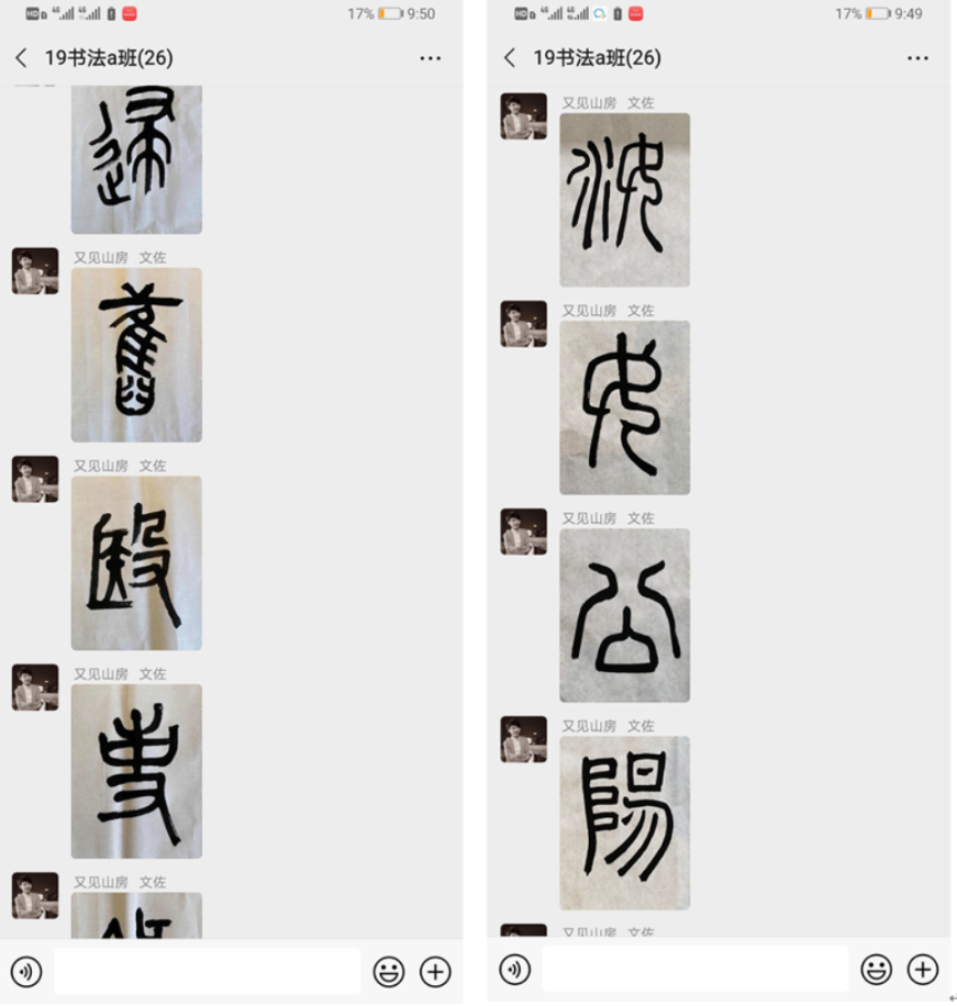 根据课程需要和实际情况,文佐老师利用简便易操作的微信平台拓展课程深度。文佐老师将示范视频精心录制成短视频,每个字都是一个单独的视频;示范过程讲解内容充实,虽只有一个字,但文佐老师将其中包含的技法和道理都能鞭辟入里,学生很受启发。学生课后也可以反复观看进行练习,很好的保证了教学质量。