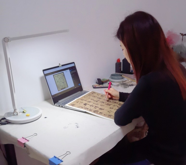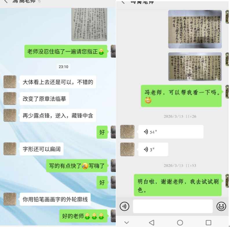 书法专业课程的教学需要将教师示范讲解更直观地呈现给学生,从冯高、文佐两位老师详细精彩的教学过程可知,老师们将书法教学专业的特点与线上教学优势有机结合,有效发挥老师直观示范的延时性,有利于学生的反复学习。教师对学生作业的逐一指导虽然比平时教学花费了更多的时间,但也获得了更加精准的有效指导。因此线上授课虽有弊端,只要因势利导,用其所长,也能获得比日常教学更好的教学效果。书法专业的其他老师也同样积极利用各种教学平台、录制示范视频这种方式来辅助学生们进行书写练习,均得到了较好的评价与反馈。疫情防控期间,我们积极面对教学方式的转变,转“危”为“机”,更好地利用各种信息技术手段保障教学秩序、保证教学质量,让网络教学展现出特殊时期的蓬勃活力。