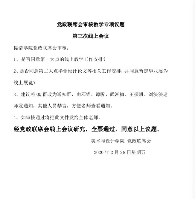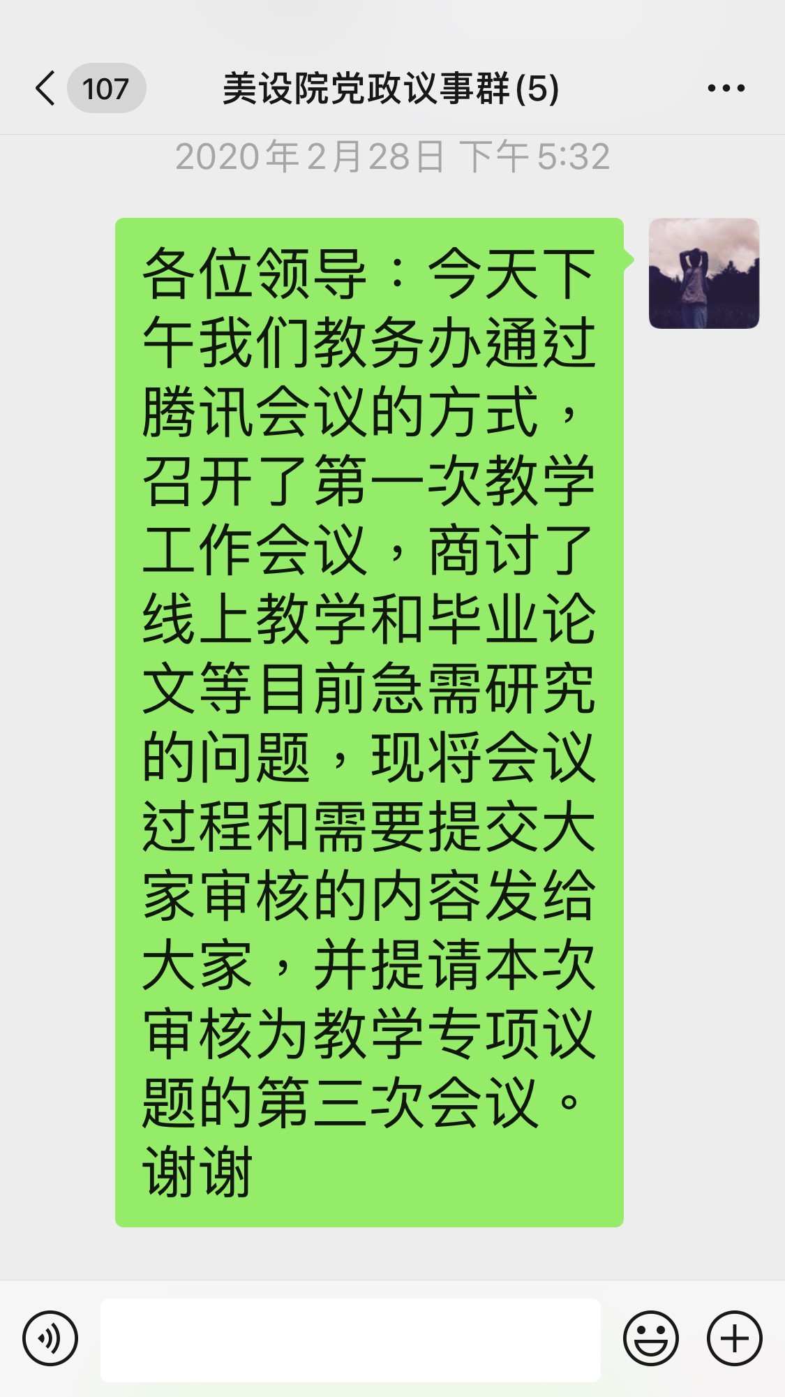 2020年2月15日至3月6日,国产内射剪辑精品福利分别在线上召开四次教学专项党政联席会议,审议教学负责人提交了《国产内射剪辑精品福利疫情防控期间在线教学与组织管理工作方案》、《国产内射剪辑精品福利教师线上教学实施与课程建设一览表》、《国产内射剪辑精品福利线上教学督导计划》等文件,明确“以课程组为单位,教学方式灵活多样,平台选择以简单易操作,保障教学为主”的工作思路。审定了全院教师、所有课程的线上教学初步计划,选用平台情况等。要求课程组内统一教学方式,课程组负责人负责填报实施情况,相同课程同平台上课,同头课教师资源互享,协同工作模式。确定了开学前试课工作安排;线上教学督导方案;教学材料要求;毕业论文实施方法;毕业作品展的调整等。从宏观到微观,层层细化,逐步落实了我院线上教学的具体工作,为我院线上教学的顺利实施奠定了基础。