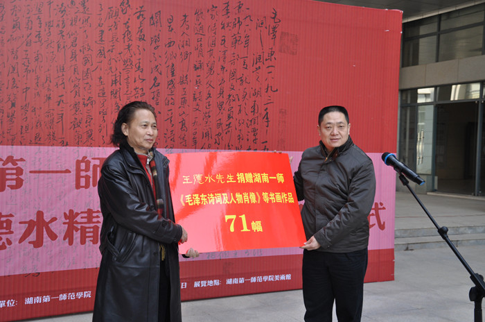 王德水先生在讲话中表达了对湖南第一师范学院在一代伟人毛泽东同志诞辰120周年暨学校建校110年之际,让自己在主席曾求学过的学校举办个人书画展的诚挚谢意,使自己表达了对一代伟人的无限敬仰之情。王德水希望这种文化的交流与合作能进一步地延续与发展,使一师的校园文化的艺术氛围得到更大地提高。