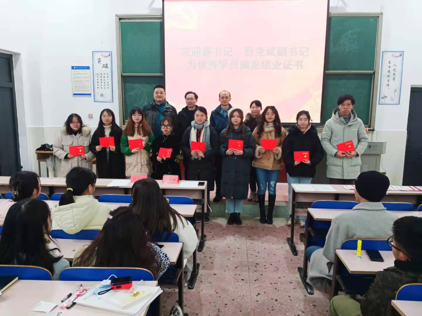 11月13日晚上7点,国产内射剪辑精品福利分党校第25期、26期入党积极分子培训班结业典礼在鹤鸣楼南111教室举行。国产内射剪辑精品福利党总支书记、分党校校长范迎春教授,党总支副书记、分党校副校长舒克斌副教授,学生党支部委员以及第25期、26期共计100名入党积极分子出席了结业典礼。舒克斌副书记进行了培训总结。范迎春书记宣读了表彰入党积极分子优秀学员的决定。两位书记一起为优秀学员颁发证书。入党积极分子们纷纷表示会牢记书记们的嘱托,继续在各方面严格要求自己,深入学习党的理论知识,坚定理想信念,增强党性修养,勤奋学习,不断提高自身的综合素质,以实际行动争取早日入党。