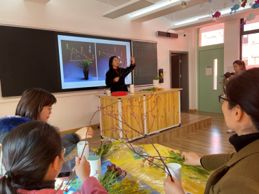 为进一步丰富老师们的精神文化生活,感受绿色健康的生活方式,湖南第一师范学院吕紫薇老师带来了一场精彩的插花艺术课堂。课上,老师先向大家介绍了她插花的初衷,即五“心”好评:耐心、静心、虚心、关心、开心;随后系统介绍了中国插花的四大类型:写景花、理念花、心象花、造型花;最后带领老师们进行瓶花创作。老师们在吕紫薇老师的耐心指导下,积极实践,巧妙构思,将自己的创意转化为一件件高低错落、疏密有致,兼具自然美和生活美的艺术品。