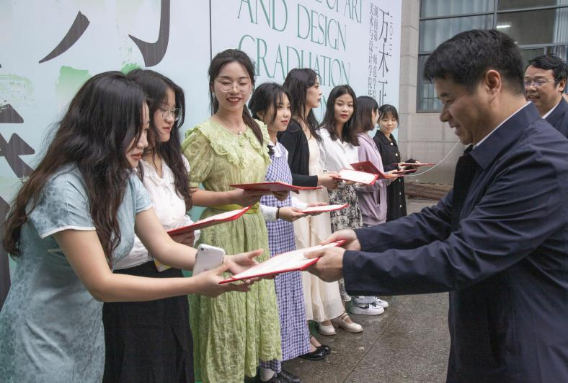 随后,教务处处长胡春光宣读优秀作品获奖名单。副校长周发明、彭晓辉为获奖毕业生颁发荣誉证书,其中美术学专业49人获优秀作品奖,书法学专业20人获优秀作品奖。美术学系、书法学系教师代表依次发言。