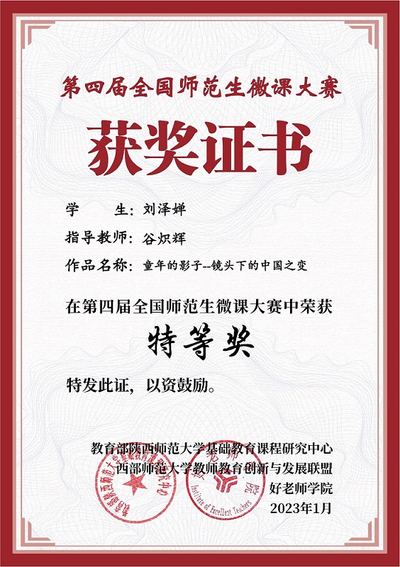 2023年1月4日,我院美术学系学生微课作品在第四届全国师范生微课大赛喜获佳绩,其中特等奖1项,一等奖1项,二等奖1项。谷炽辉老师获“优秀指导教师”。此次大赛展现了我院美术学系学生较强的专业技能和能力,也达到了以赛促教、以赛促学的效果,对进一步提高师范生信息化教学能力有着积极促进作用。