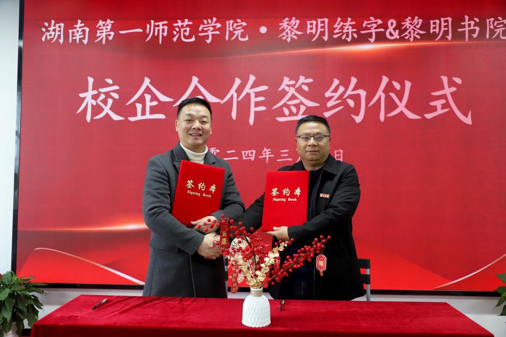 随后,在与会人员的见证下,赵奇钊与赵黎明代表校企双方签订了校企战略合作协议,我校授予黎明练字&黎明书院“湖南第一师范学院实习实训基地”“湖南第一师范学院就业基地”牌匾。