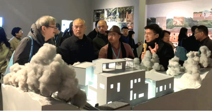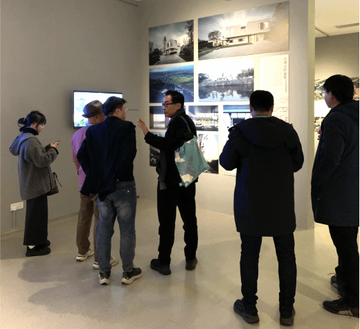 钟炽兴、李楚智两位老师在“风自海上”2024建筑艺术作品展上为中国美术家协会建筑艺术委员会主任、中央美术学院副院长吕品晶教授(左二)和天津大学建筑学院孔宇航教授(左一)介绍参展作品