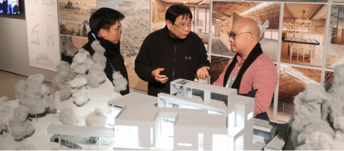 钟炽兴、李楚智两位老师在“风自海上”2024建筑艺术作品展上与中国美术家协会建筑艺术委员会秘书长、中央美术学院建筑学院程启明教授(中)交流参展作品