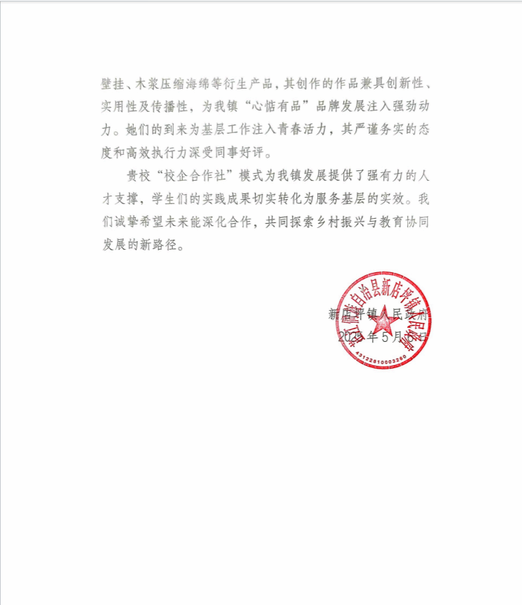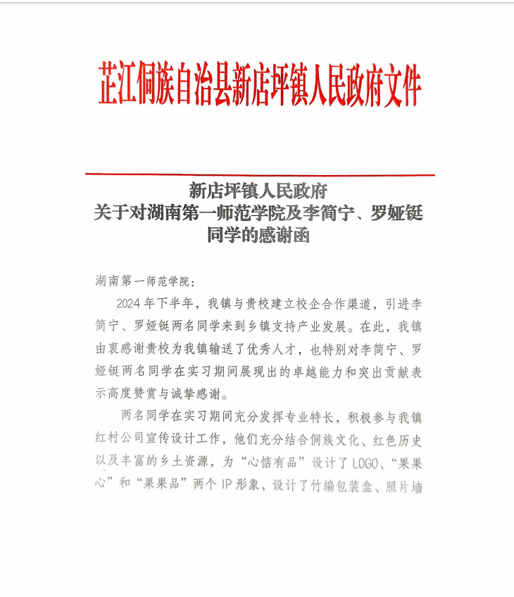 新店坪镇人民政府关于对湖南第一师范学院及李简宁、罗娅铤同学的感谢函