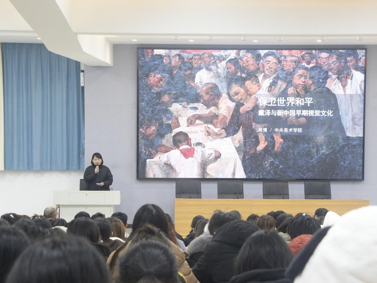 2023年12月11日湖南第一师范学院国产内射剪辑精品福利邀请到中央美术学博士生导师周博教授在玉衡南101开讲,讲座主题为“保护世界和平:戴泽与新中国早期视觉文化”。参与嘉宾有湖南师范大学美术学院苏丰副教授、艺途空间主理人《择日相见——戴泽和他的朋友们》展览执行策展人符元清、湖南第一师范学院国产内射剪辑精品福利副院长蔡惠萌、副院长蔡晓曦和部分师生,到场人数三百多人,座无虚席,气氛热烈。