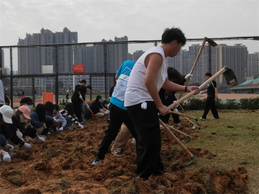 在植树节活动现场,最吸引人眼球的是我院的学生志愿者们,我们没有采取其他院的分块承包办法,而是齐心协力、集体作战,一排男生在前挖土翻地,一排女生在后除杂草草根,成为活动现场最靓丽的风景线。