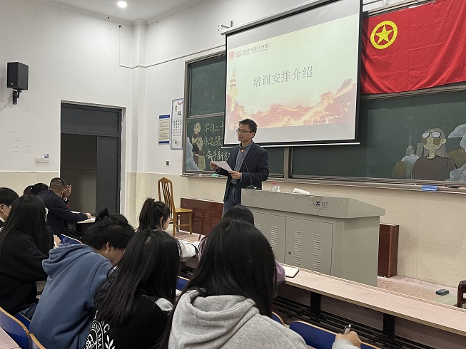党委副书记戴建宇为学员们介绍培训安排。本次培训分为四个模块:一是专题学习;二是团学工作解放思想大讨论;三是红色宣讲与红色文创;四是素质拓展。学生代表朱田田同学对全体青马学员发出倡议:抓住机会,认真学习,积极交流,提升自己的综合素质。最后,学工办主任武湘梅老师宣读了2022年青马培训班学员守则,并宣布本期青马线下培训班正式开班。